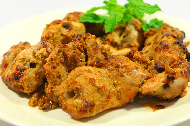 6) Serve with onion rings, lemon slices, mint leaves and chutney.